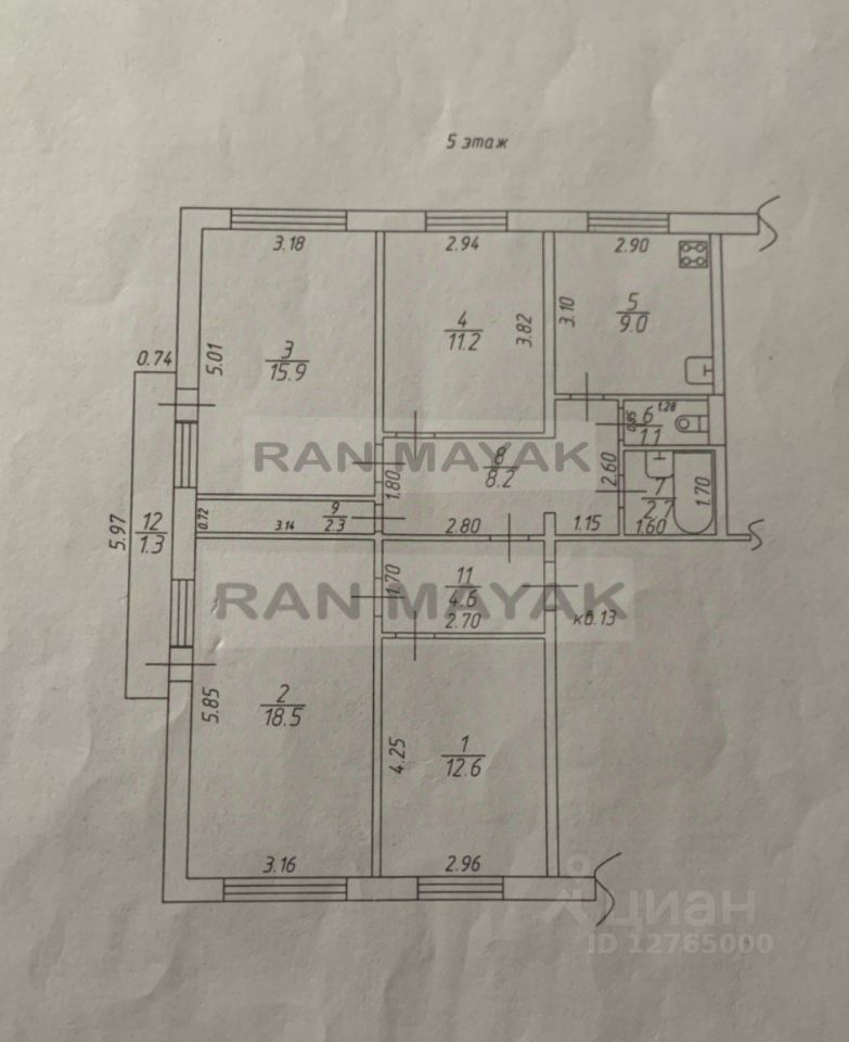 Общая площадь, 87.4 м.кв; 5 этаж 5-ти этажного дома.