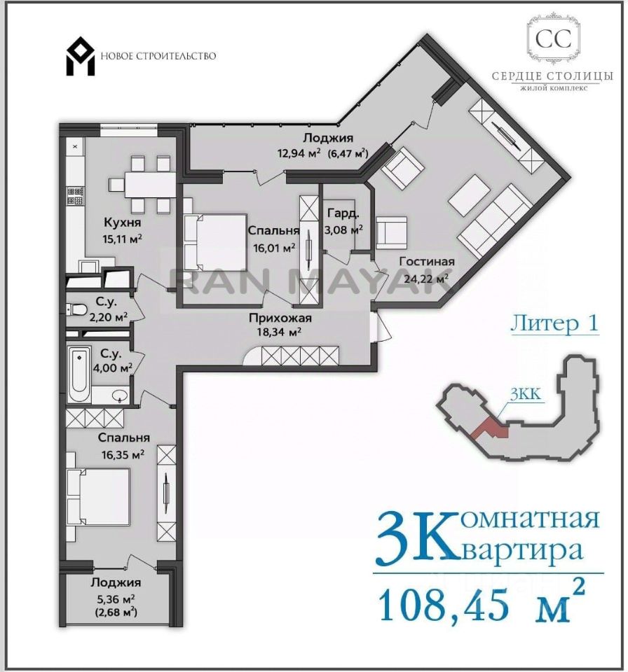 Лоджии: 2 шт. Одна большая (13 м²), вторая (5,3 м²) с видом на горы.