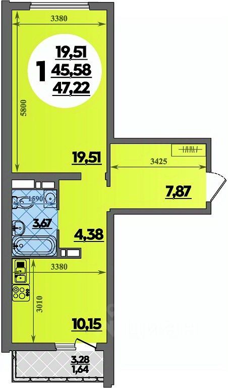 • Санузел под ключ: ванна с декоративным экраном, удобная раковина с пьедесталом, смесители, полотенцесушитель. На полу керамогранит.