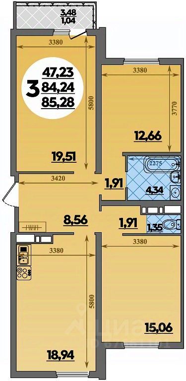 Продаётся 3-комнатная квартира в строящемся доме (Литер 3), срок сдачи: II-кв. 2027, общей площадью 85.28 кв.м., на 7 этаже.