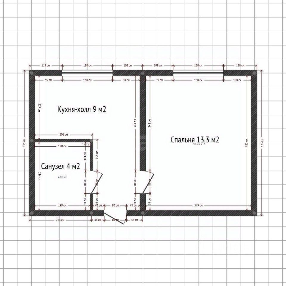 1-к квартира, состоящая из одной комнаты 13.3 кв.м., кухни-холла 9 кв.м. и санузла 4 кв.м.