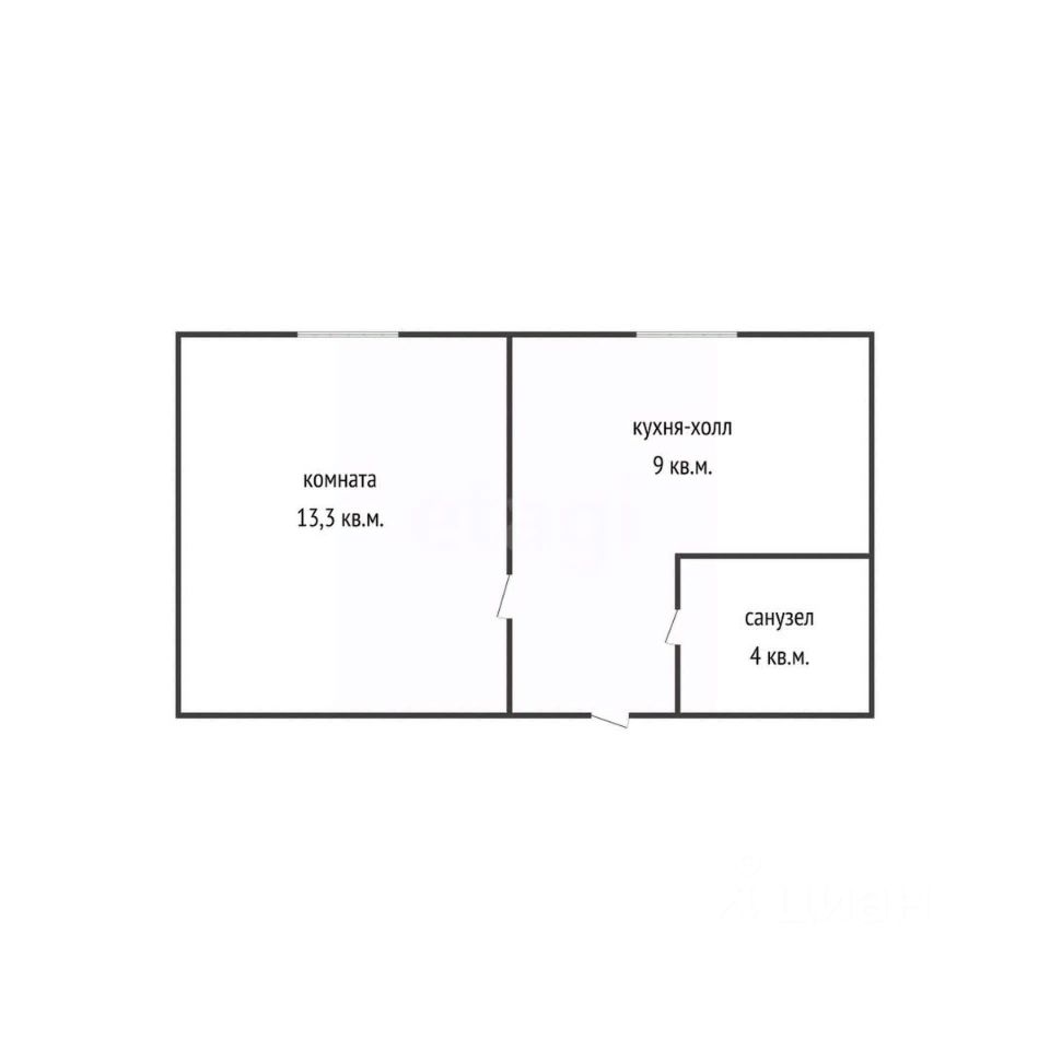 Поступила в продажу 1к квартира, состоящая из одной комнаты 13.3 кв.м., кухни-холла 9 кв.м. и санузла 4 кв.м.