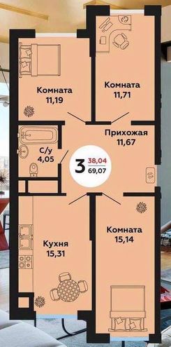 Квартира имеет удобную планировку: просторная гостиная, две спальни, кухня, совмещенный санузел.
