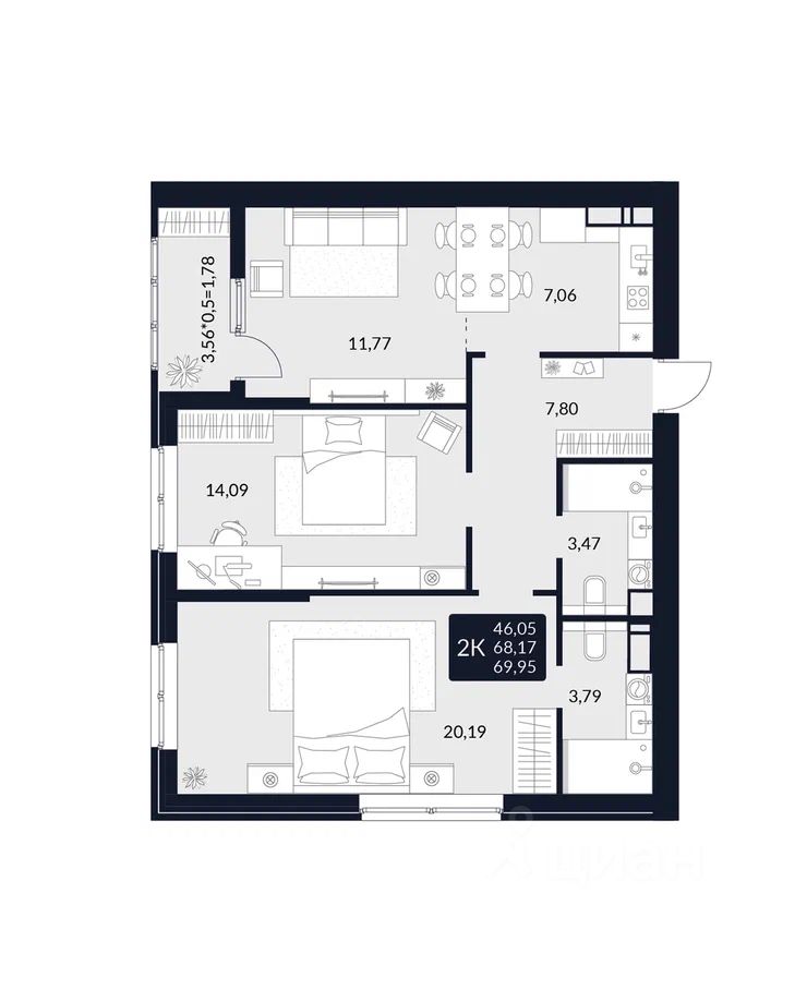 Общая площадь69,95 м²