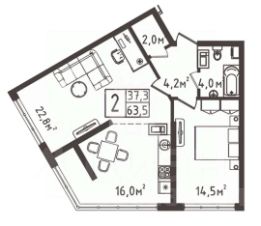 Общая площадь квартиры 64 кв.м. Дом сдан