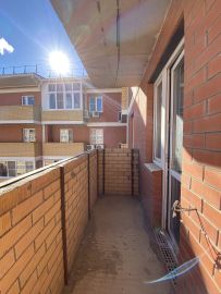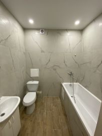 В квартире сделан ремонт - стены окрашены, ламинат на полу в комнатах, на полу в коридоре, на кухне и в ванной комнате - плитка. Дополнительно уже делают натяжные потолки и плинтусы.