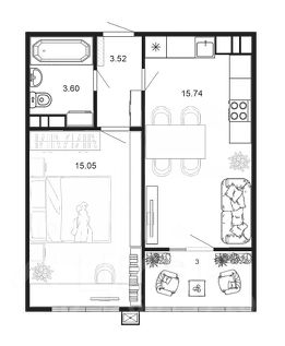 - кухня-гостиная 15,74 кв.м - пространство, где легко разместится и рабочая зона кухни, и зона отдыха.