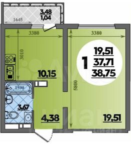 Общая площадь квартиры составляет 41,1 кв. м, с жилой площадью 19,9 кв. м и просторной кухней 10,15 кв. м.