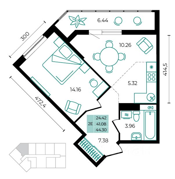 Общая площадь44,3 м²