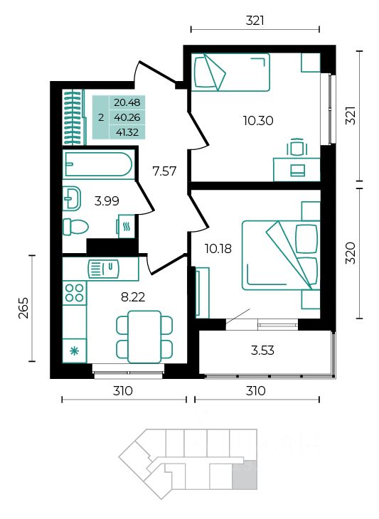 Общая площадь41,32 м²