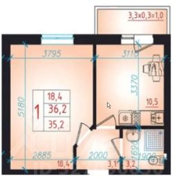 Общая площадь 35,2 кв.м, площадь кухни 9,7 кв.м. площадь комнаты 18 кв.м., лоджия 3 кв.м., совмещенный санузел 4 кв.м., прихожая 3,6 кв.м.