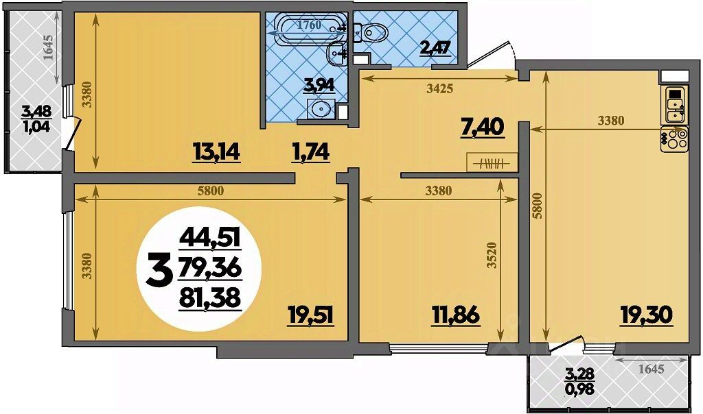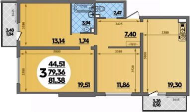 Продаётся 3-комнатная квартира в строящемся доме (Литер 4), срок сдачи: II-кв. 2027, общей площадью 81.38 кв.м., на 1 этаже.