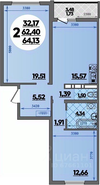 Продаётся 2-комнатная квартира в строящемся доме (Литер 4), срок сдачи: II-кв. 2027, общей площадью 64.13 кв.м., на 7 этаже.