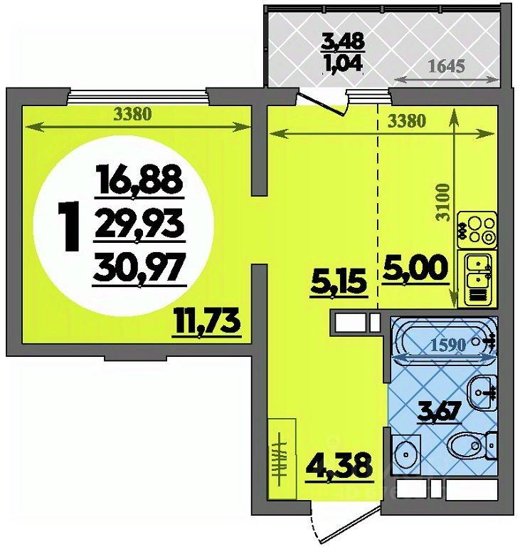Продаётся студия в строящемся доме (Литер 4), срок сдачи: II-кв. 2027, общей площадью 30.97 кв.м., на 3 этаже.