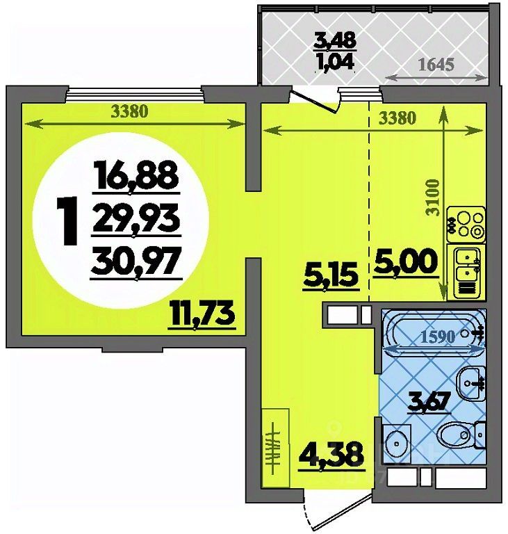 Продаётся студия в строящемся доме (Литер 4), срок сдачи: II-кв. 2027, общей площадью 30.97 кв.м., на 7 этаже.