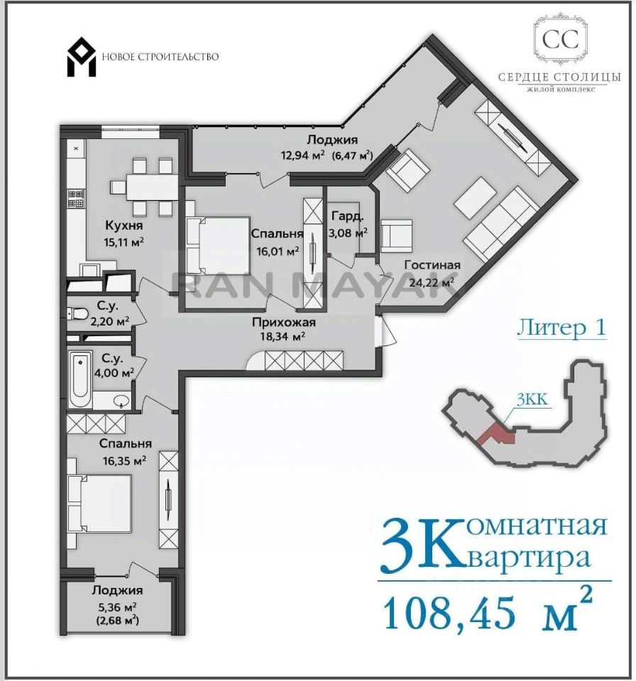 Лоджии: 2 шт. Одна большая (13 м²), вторая (5,3 м²) с видом на горы.
