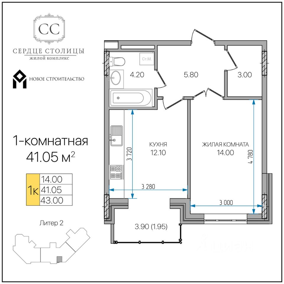 Общая площадь41,05 м²