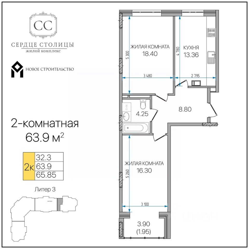 Общая площадь63,9 м²