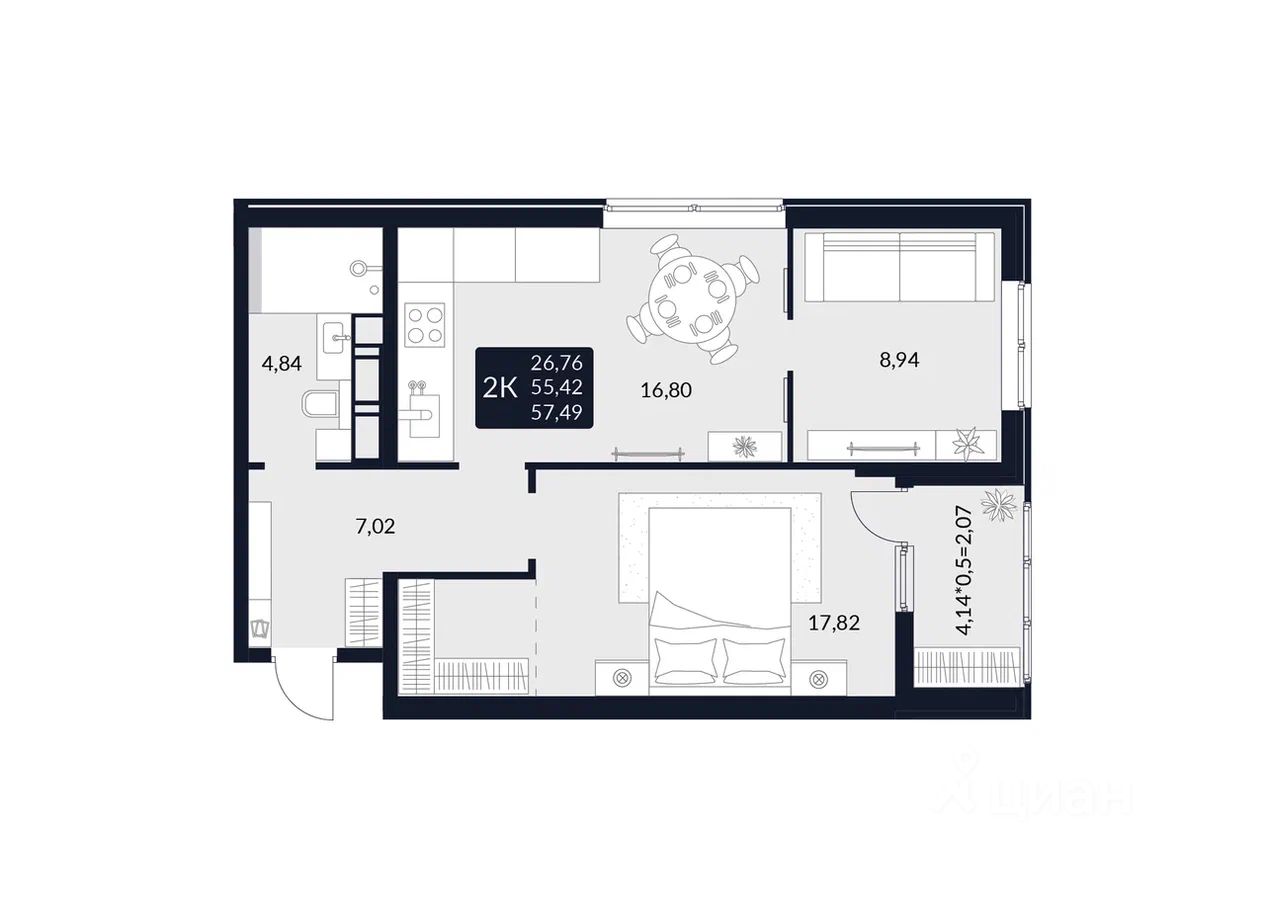 Общая площадь57,49 м²