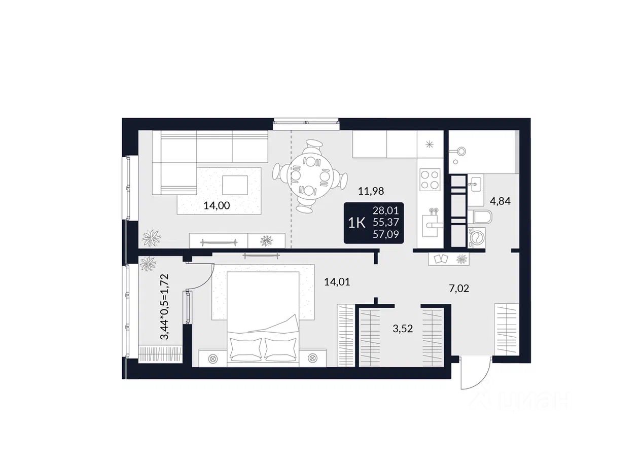 Общая площадь57,09 м²
