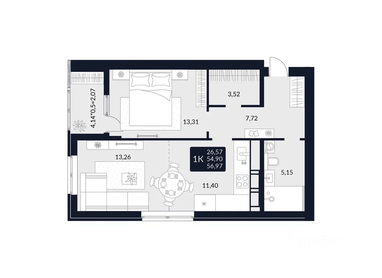 Общая площадь56,97 м²