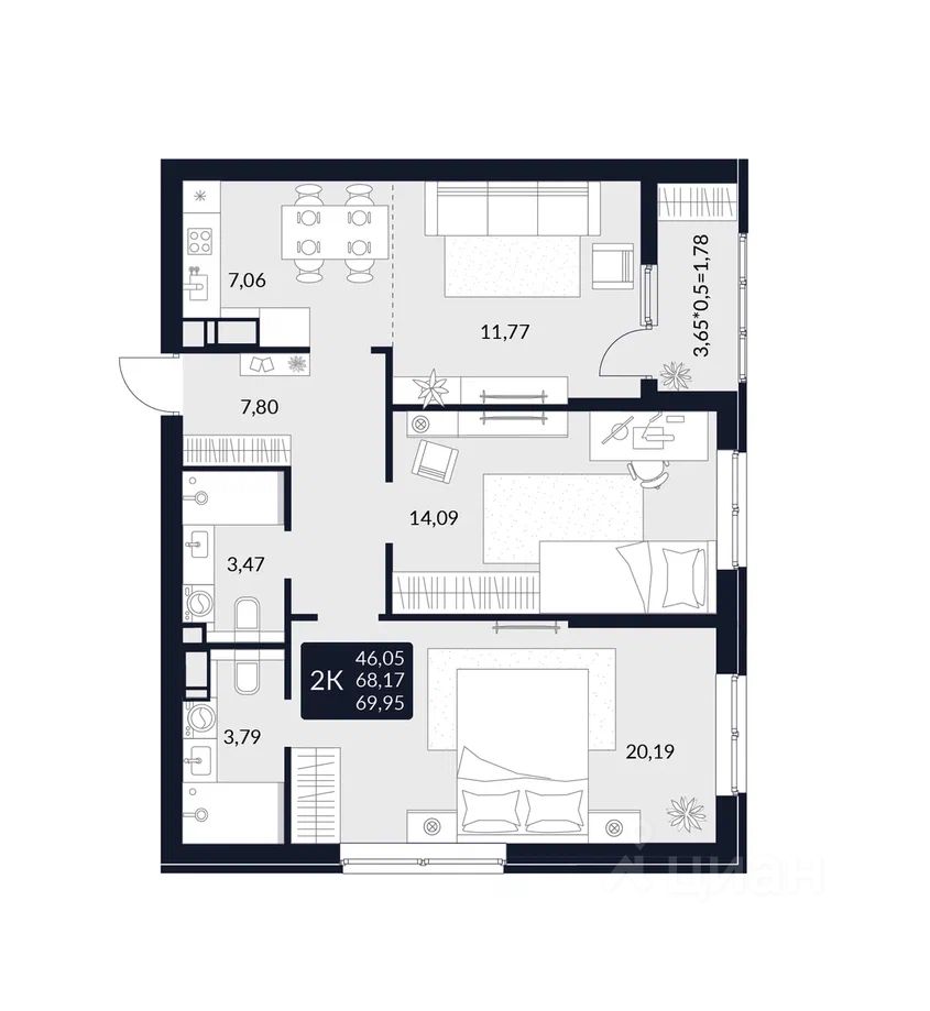 Общая площадь69,95 м²