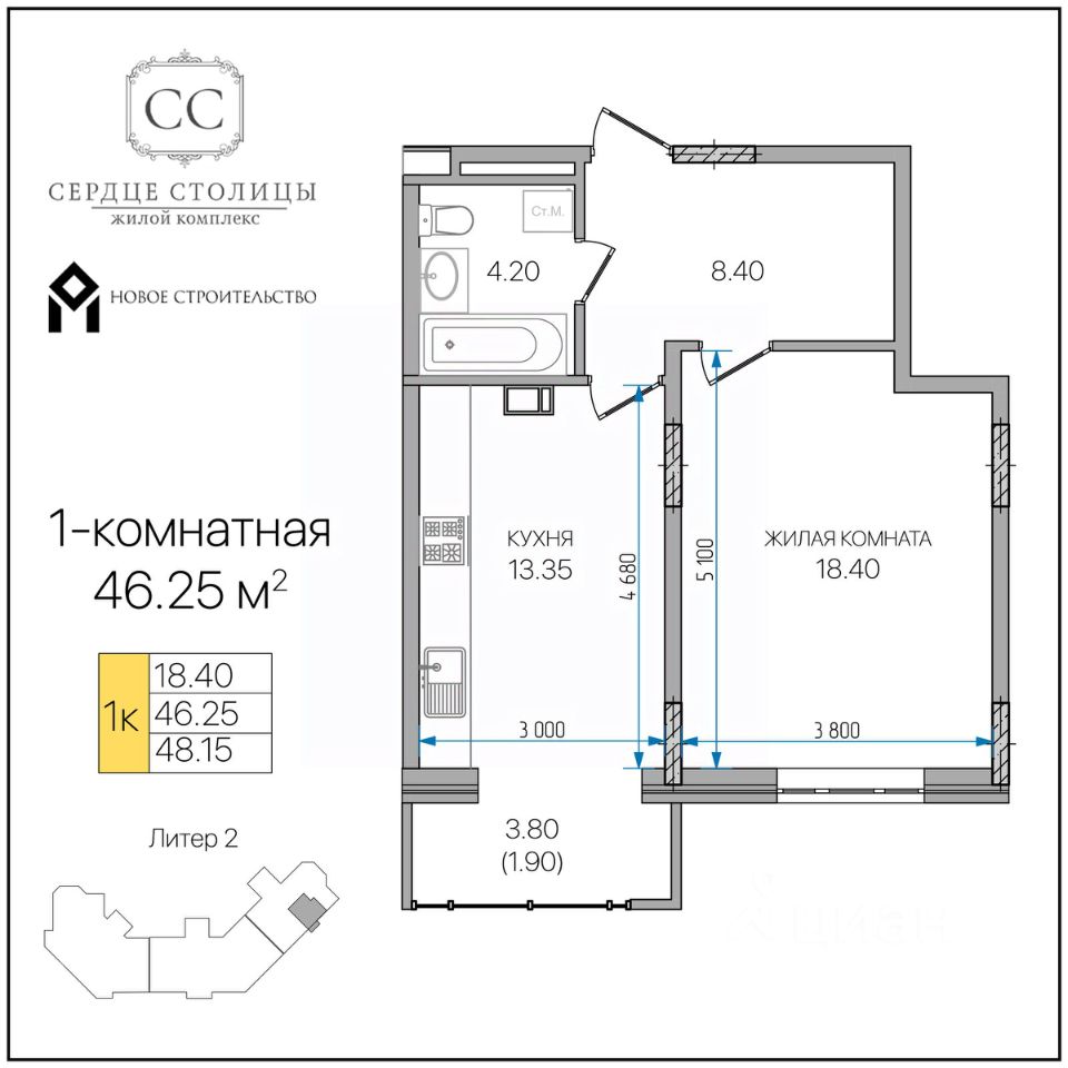 Продается 1-комн. квартира, 46,25 м²