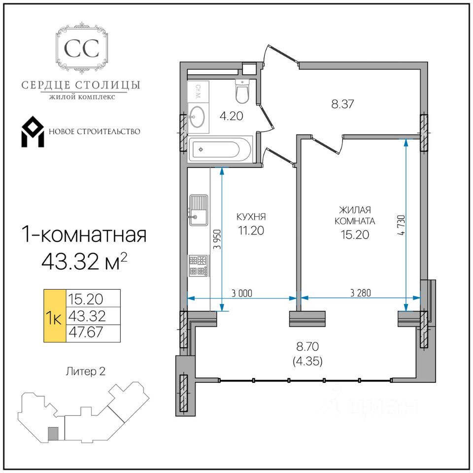 Общая площадь43,32 м²