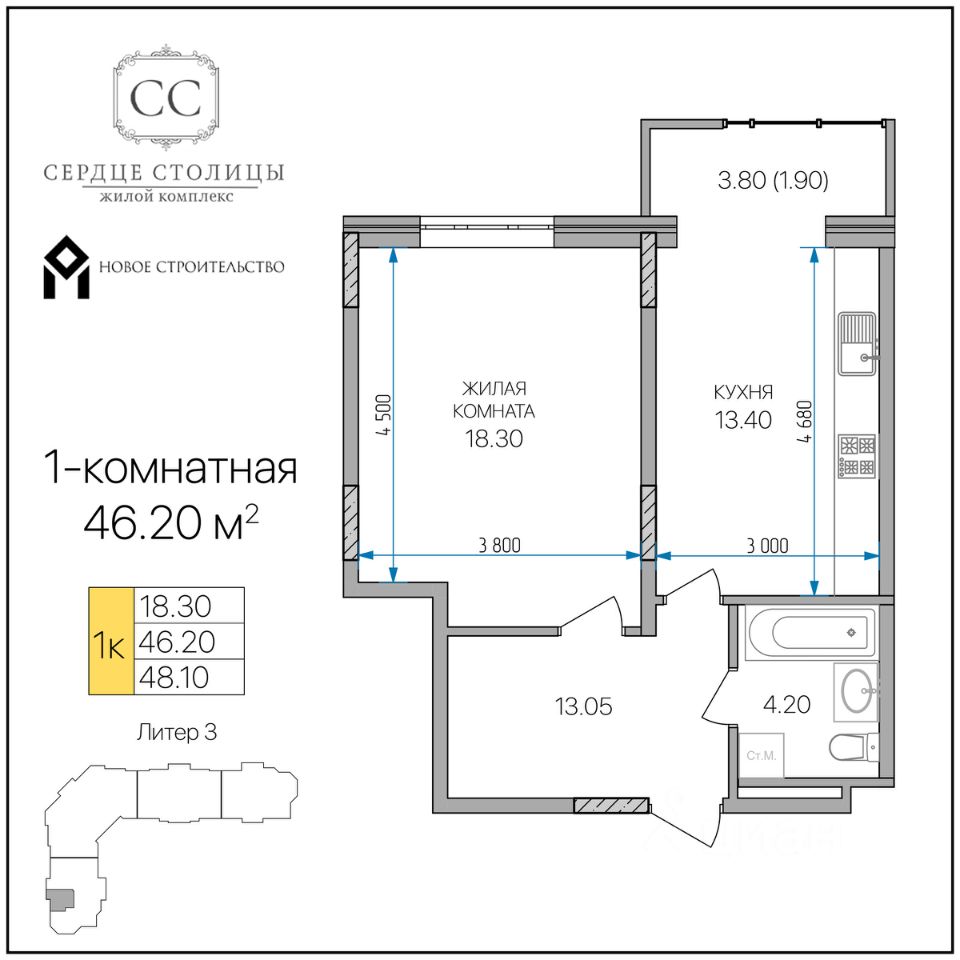 Продается 1-комн. квартира, 46,2 м²