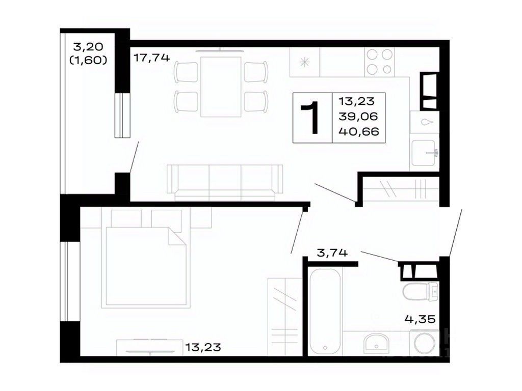 Общая площадь40,66 м²