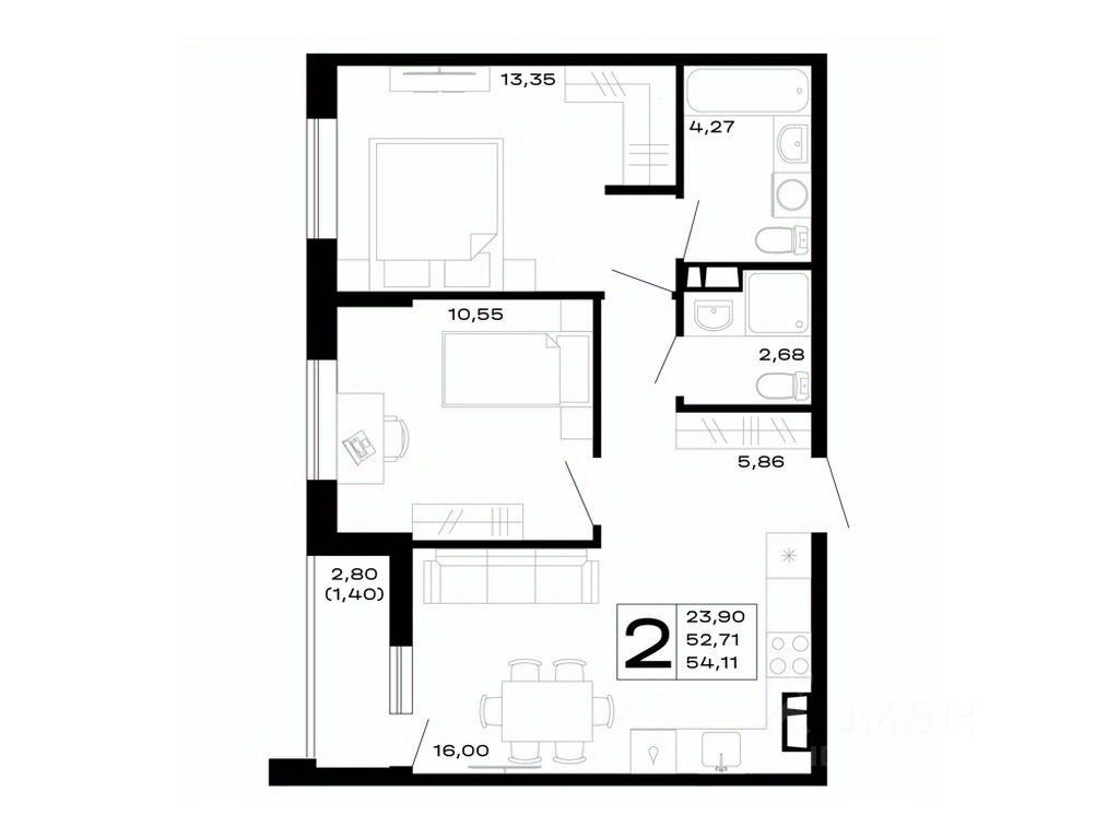 Общая площадь54,11 м²