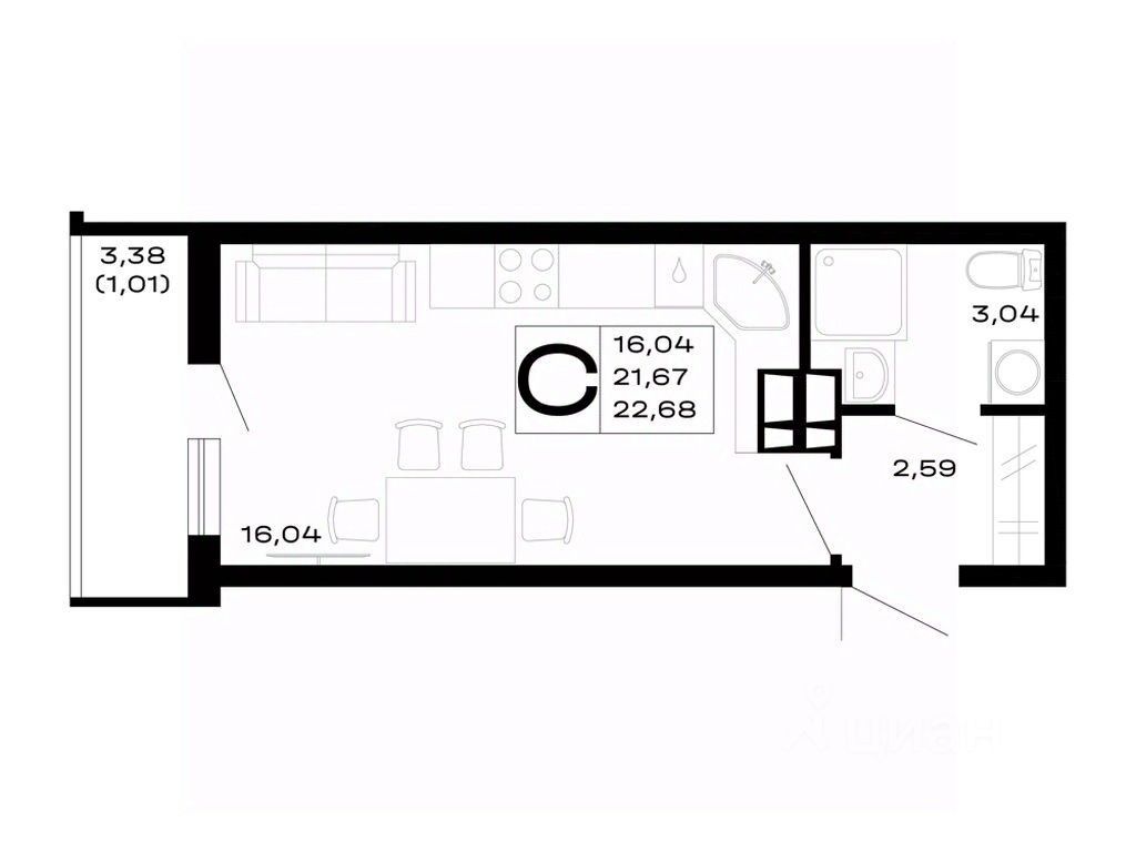 Общая площадь22,68 м²