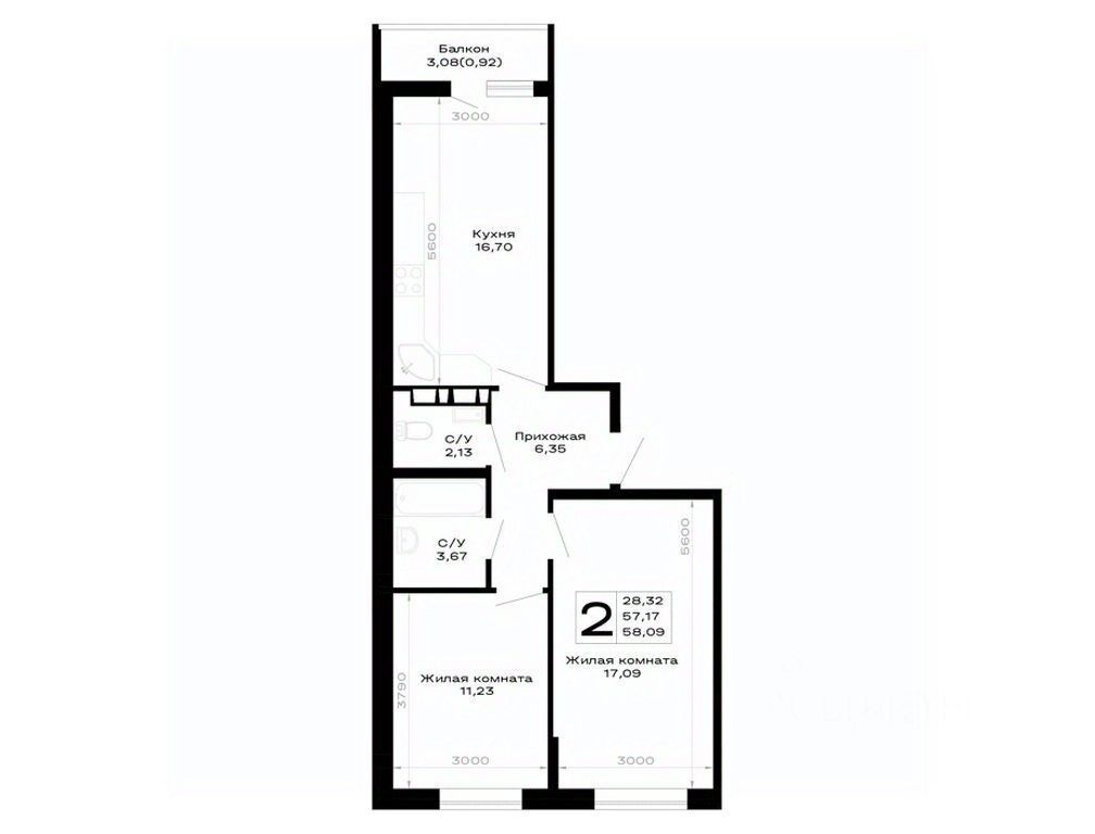 Общая площадь58,09 м²
