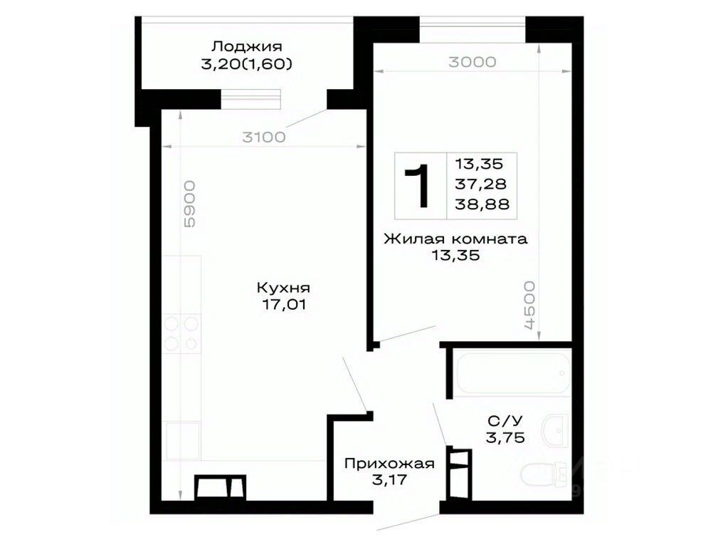 Общая площадь38,88 м²