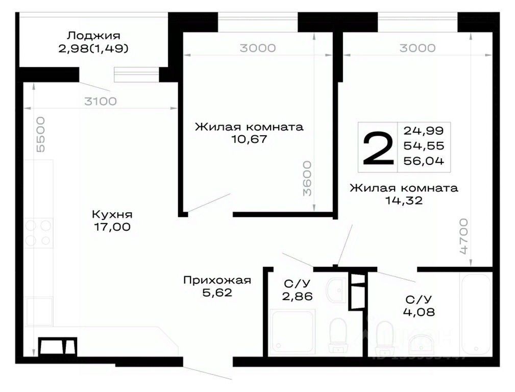Общая площадь56,04 м²