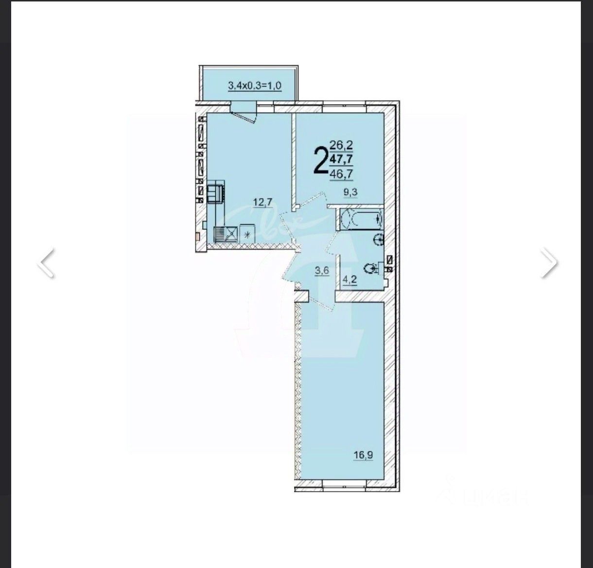 Площадь квартиры 46.4 кв м+ балкон 3,5 кв.м. Функциональная планировка: кухня-гостиная с выходом на балкон 12.7 кв м, спальня 16.9 кв.м, ванная комната -4.2 кв м