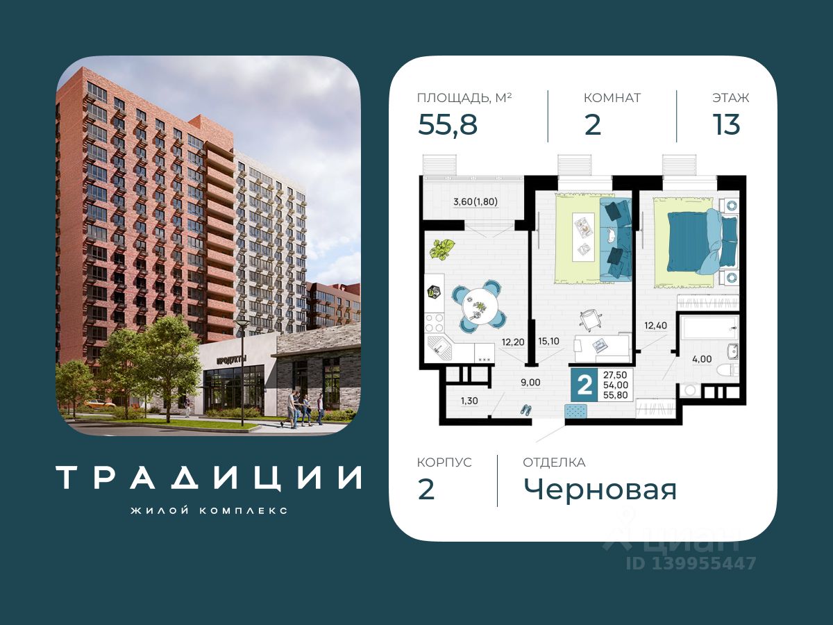 Литер 6, 13 этаж, 123. ЖК "Традиции" - это новый современный комплекс на 7 гa, в 10 минутах от Краснодара. Баланс города и природы.