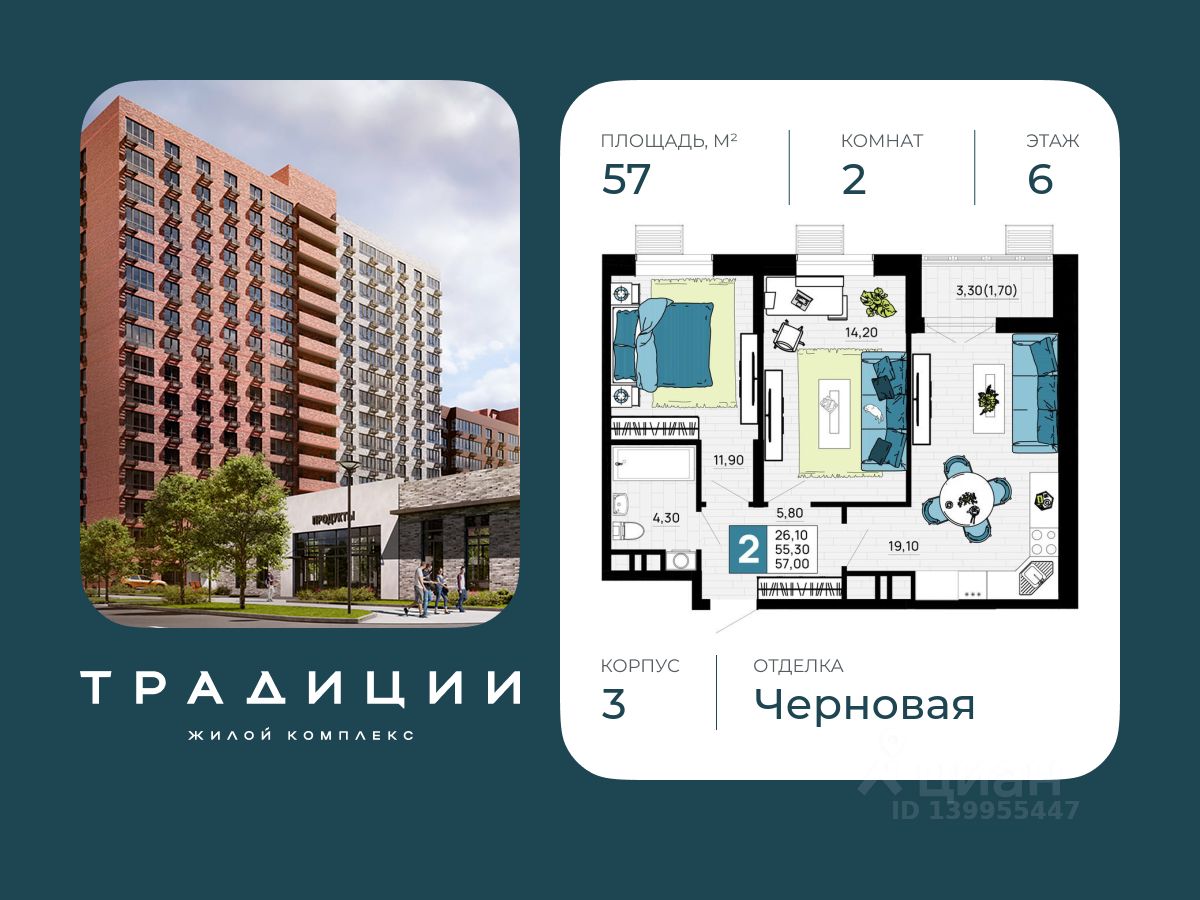 Литер 5, 6 этаж, 46. ЖК "Традиции" - это новый современный комплекс на 7 гa, в 10 минутах от Краснодара. Баланс города и природы.