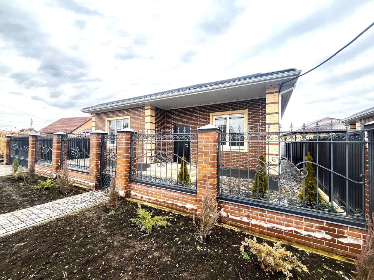 Участок огорожен по периметру забором, с фасадной стороны — кирпичные колонны, кованый забор, ворота, калитка.
