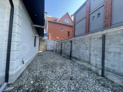 Фундамент фасадного забора свайно-ленточный с соединением с крайними бетонированными колонами (воротных проемов) углубленным бетонированным ригелем 25 см на 45 см арматура 14 мм. Имеются одни откатные ворота 4,2 м на 2 м (с подведенным электричеством под автоматику) и одни распашные 3,5 м на 2 м и одна калитка 1,2 м на 2 м. Сваи (18 свай) и лента фундамента из арматуры 14 мм. Стена забора из шлакоблока с бетонными колонами внутри и по краям (каждые 3 ряда блоков проложена железная арматура 12 мм). Облицовка фасадного забора из белого дагестанского камня в соответствии со стилистикой дома (карнизы, пилястры ). Дагестанский камень забора отшлифован и пропитан французской пропиткой.