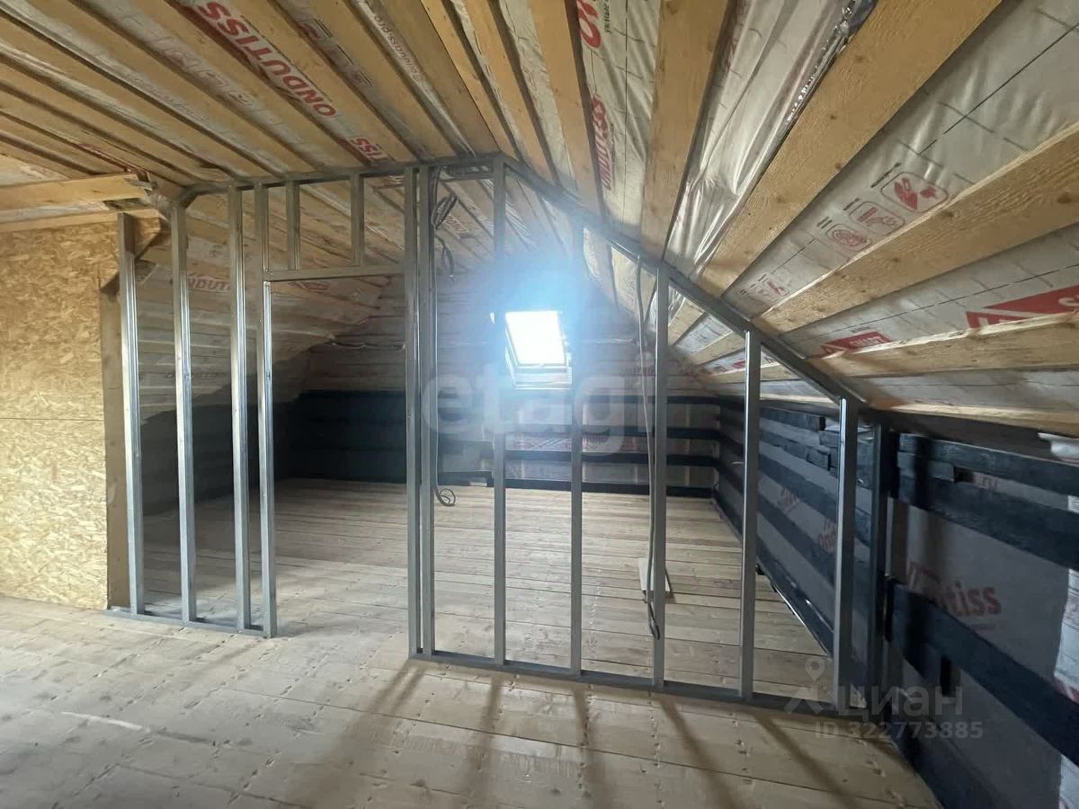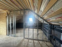 Крыша дома из трехслойной мягкой кровли (зубы дракона) черного цвета (гарантия от производителя 25 лет) с утеплением минеральной ватой покатов и пола второго этажа 150 мм. На крыше три вентиляционных выхода (грибка) над каждым помещением и мансардное окно фирмы FАКRО (78 см на 118 см) и шикарное витражное окно. На мансарде дома черновые полы и покаты изнутри обиты пароизоляционной пленкой (для жилых помещений) с обшивкой досками под будущее крепление гипсокартонна. По периметру дома свес кровли шириной 1 м и подшит софитами с перфорацией под Евробрус. По периметру участка имеется бетонный забор (2,3 м высотой), а вдоль заезда через откатные ворота забетонированы толстостенные металлические трубы 100D для будущего навеса.
