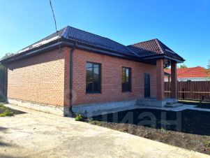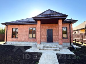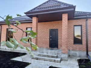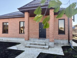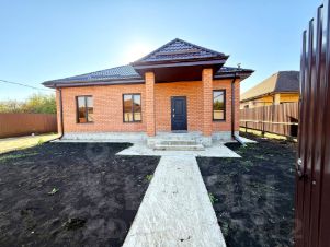 Одноэтажный коттедж возведен в современном архитектурном стиле по индивидуальному проекту на свайно-ростверковом фундаменте, отмостка — по периметру дома, материал стен — газоблок, наружные — облицовочный керамический кирпич, металлопластиковые окна с внешней ламинацией, кровля — металлочерепица, крытая терраса.