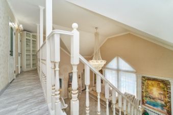 Дом построен полностью из кирпича, во внутренней отделке использован натуральный камень, лестница из массива ясеня.