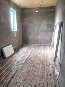 В доме выполнена предчистовая отделка: стяжка пола, теплый пол в местах общего пользования по всей площади гостиной на первом этаже, и в двух санузлах, штукатурка стен, разводка сантехнического, электрического и отопительного оборудования, радиаторы отопления, двухконтурный котел.