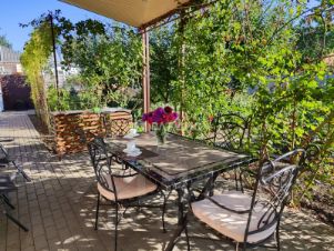 На заднем дворе оборудован навес с зоной отдыха.