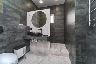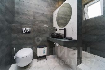 На полу первого этажа и лестнице уложен дорогой керамогранит, установлен теплый пол. В санузле на полу и стенах также керамогранит (сочетание цветов выбрано в стиле всего дома); раковина, мыльница и стакан для зубных щёток выполнены из натурального камня в едином стиле.
