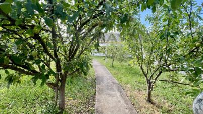 За домом — сад с фруктовыми деревьями. Забор из профнастила.