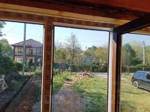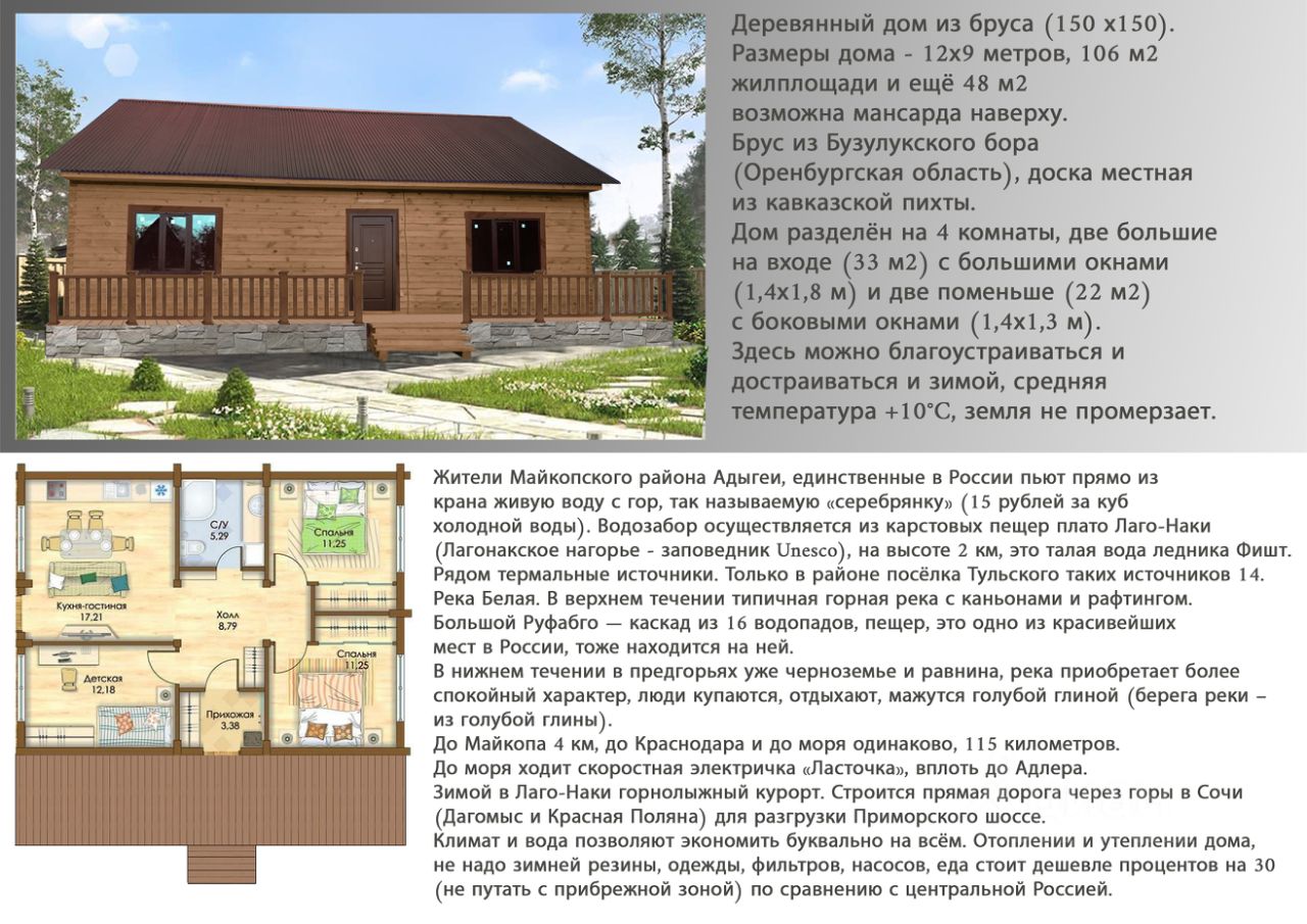 Продаётся деревянный дом из бруса (150 х150). Размеры дома - 12х9 метров, 106 м2 жилплощади и ещё 48 м2 возможна мансарда наверху. Брус из Бузулукского бора (Оренбургская область), доска местная из кавказской пихты. Дом разделён на 4 комнаты, две большие на входе (33 м2) с панорамными окнами (1,4х1,8 м) и две поменьше (21 м2) с боковыми окнами (1,4х1,3 м).