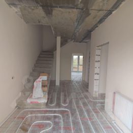 В доме выполнена предчистовая отделка:Разводка всех коммуникаций, стены оштукатурены и ошпаклеваны,стяжка пола, теплые полы в местах общего пользования, в комнатах установлены радиаторы .