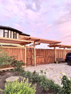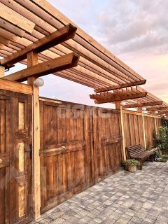 По периметру красивый дизайнерский деревянный забор.